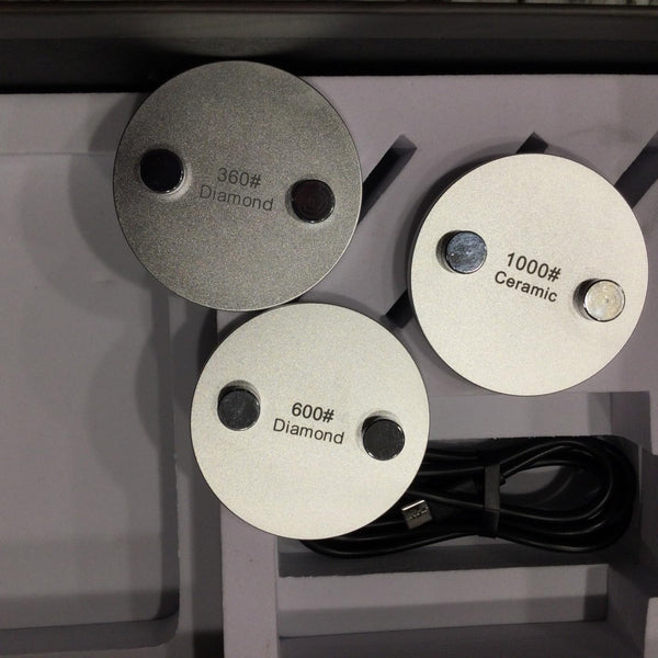 Includes 360# diamond (coarse), 600# diamond (medium), and 1000# ceramic (fine) discs. Swap easily to match your sharpening needs.